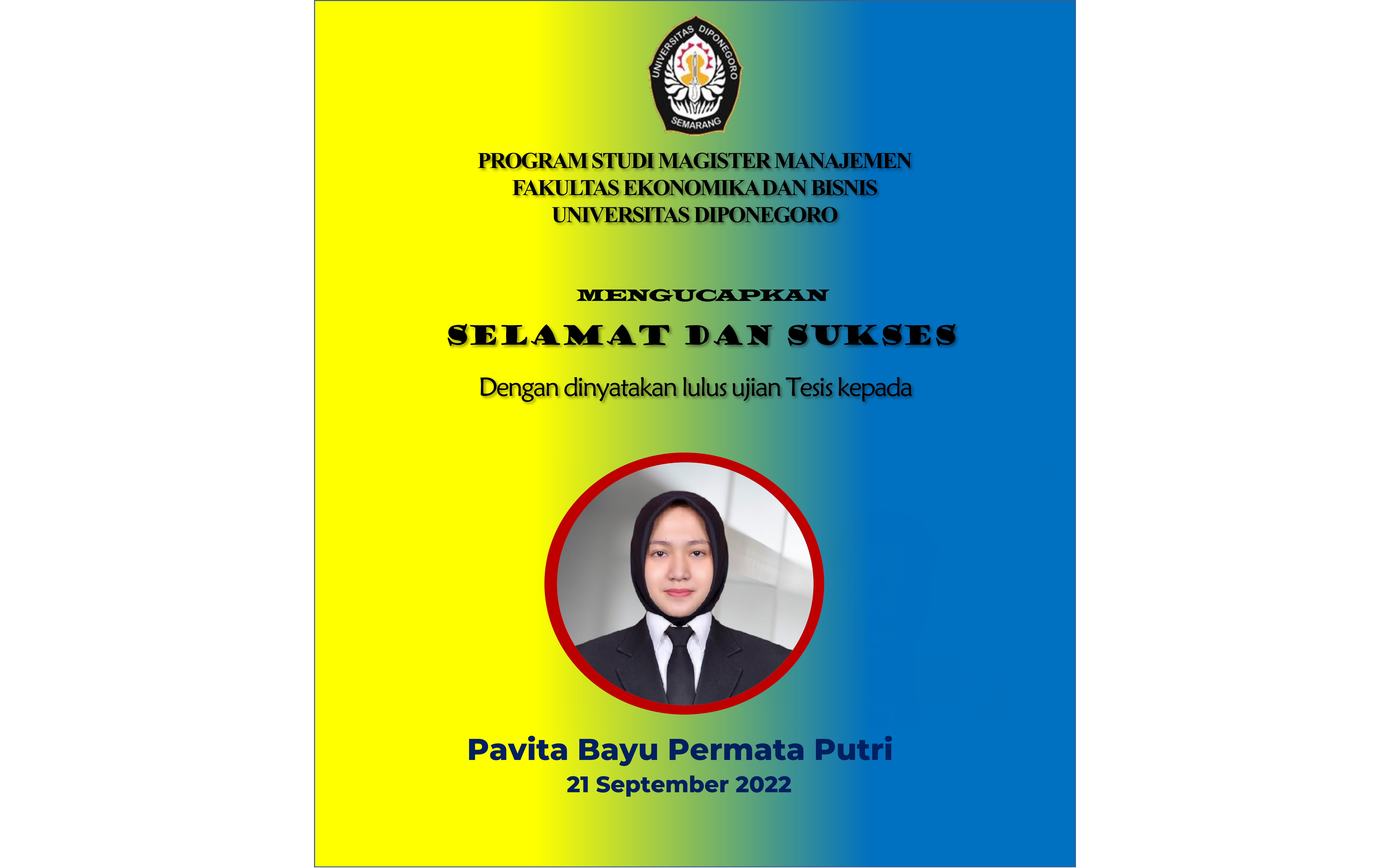 Selamat dan sukses kepada mahasiswa Prodi MM FEB UNDIP yang telah dinyatakan lulus ujian Tesis pada hari Rabu, 21 September 2022 dengan Ketua penguji Dr. Wisnu Mawardi,M.M. serta Anggota penguji Dr.E.Drs. Hersugondo, M.M dan Surya Raharja,S.E., M.Si, Akt., Ph.D