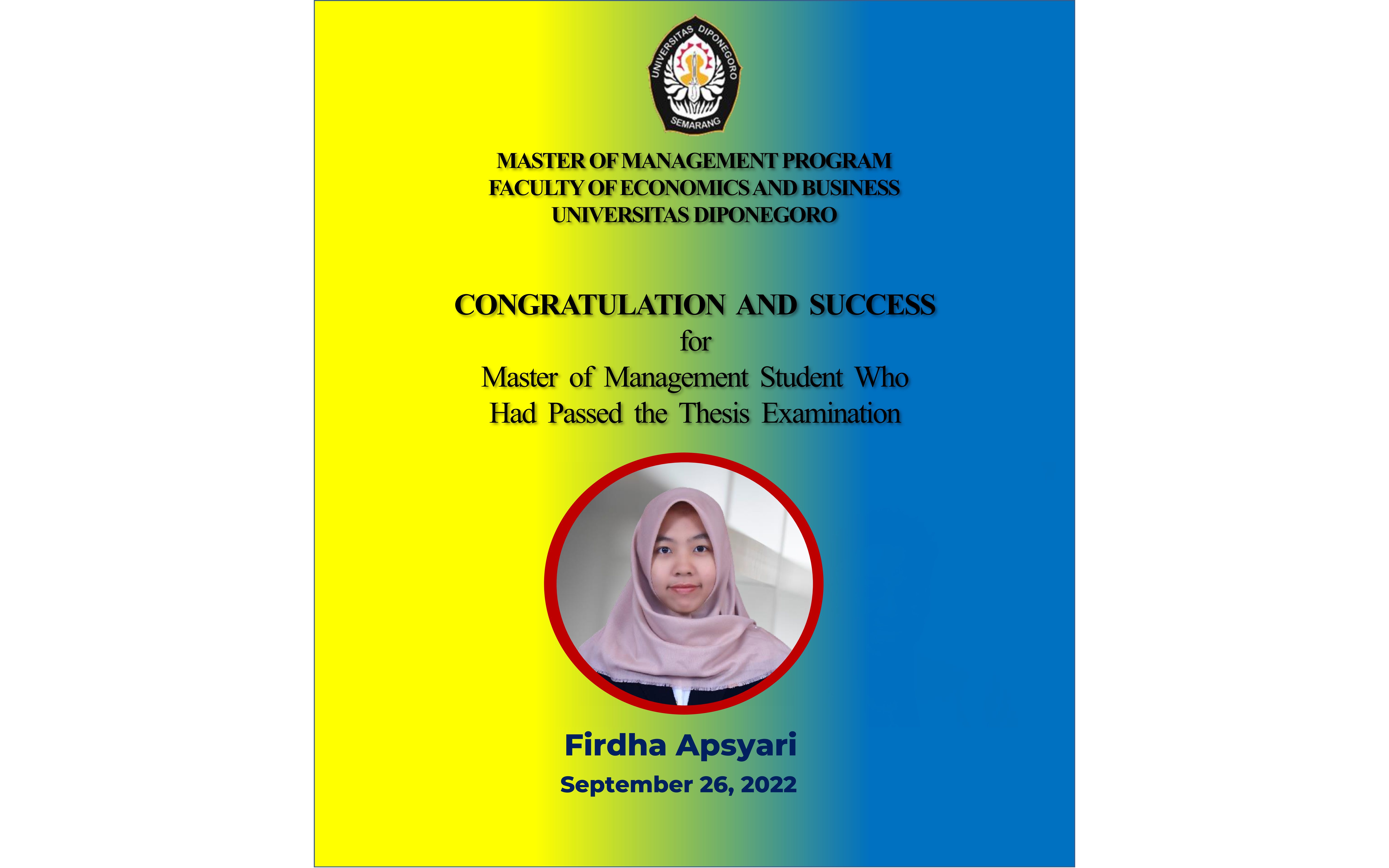 Congratulation and success to Firdha Apsyari, the student of Master of Management Program Faculty of Economics and Business Universitas Diponegoro who had passed Thesis Examination on September 26, 2022. The chief examiner was Dr. Ahyar Yuniawan, M.Si and the members are Dr. E. Yoestini, M.Si and Mirwan Surya Perdhana, S.E., M.M, Ph.D