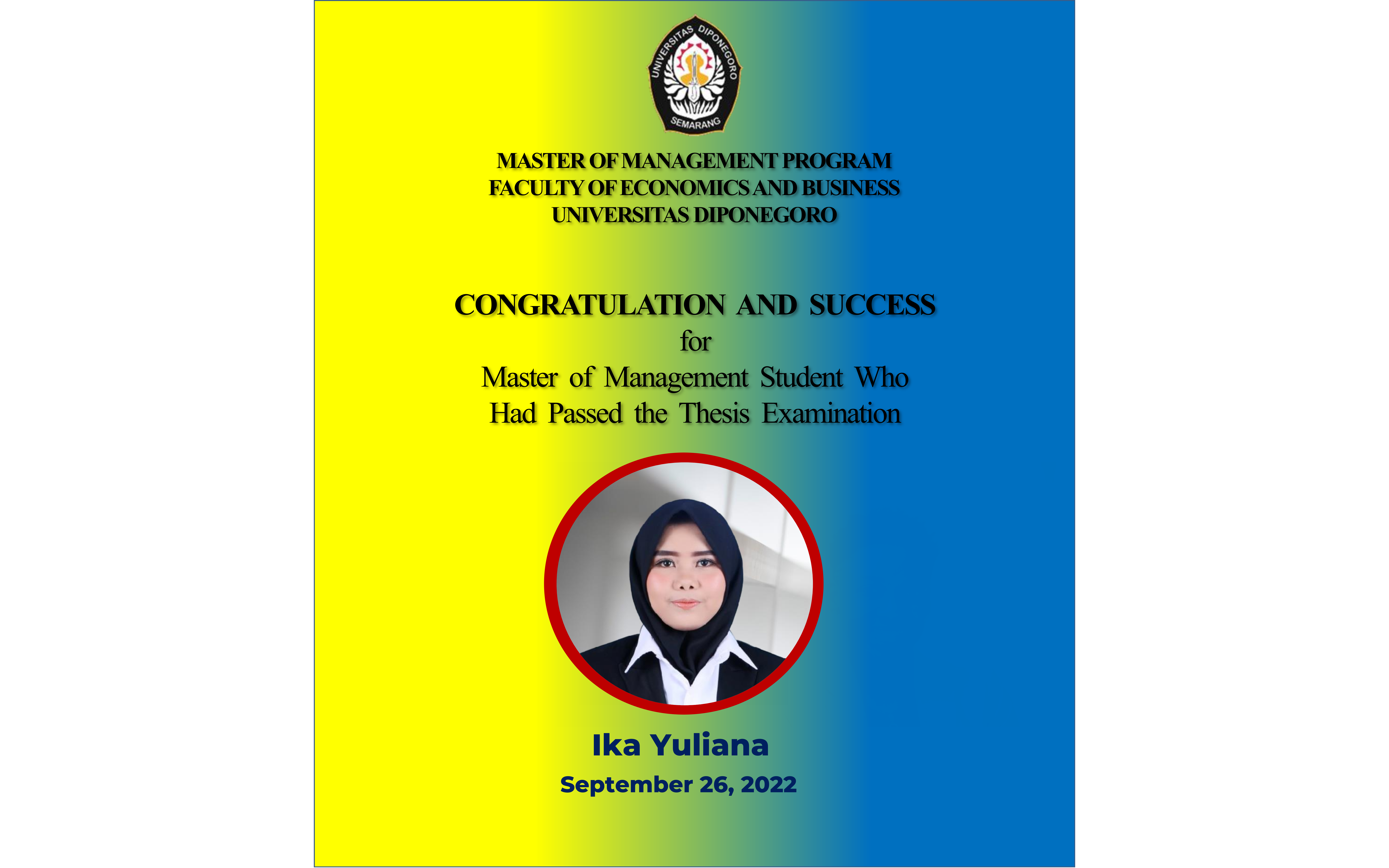 Congratulation and success to IKA YULIANA, the student of Master of Management Program Faculty of Economics and Business Universitas Diponegoro who had passed Thesis Examination on September 26, 2022. The chief examiner was I Made Sukresna, S.E., M.Si, Ph.D and the members are Mirwan Surya Perdhana, S.E., M.M., Ph.D and Dr. Eisha Lataruva,, S.E., M.M.