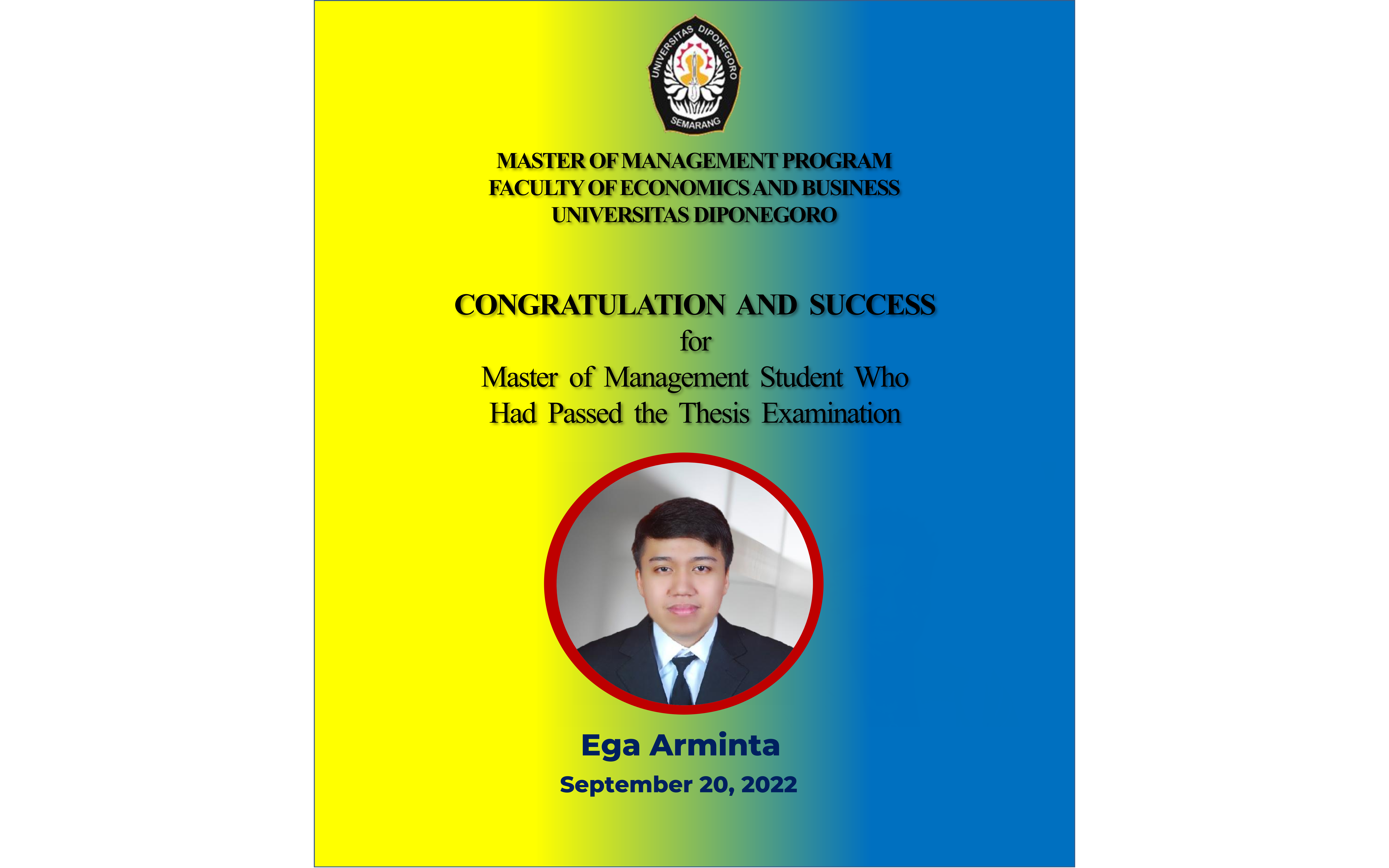 Congratulation and success to Ega Arminta, the student of Master of Management Program Faculty of Economics and Business Universitas Diponegoro who had passed Thesis Examination on September 20, 2022. The chief examiner was Dr. Irene Rini DP, ME and the members are Dr. E. Drs. Hersugondo, M.M. and Dr. Wisnu Mawardi, M.M.